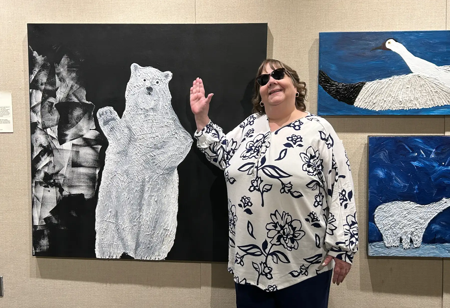 That moment planted a seed. Lynda began experimenting with texture and layers, exploring materials like resin and modelling paste to give her canvases a tactile dimension. She applied for a grant from the Ontario Arts Council. She created her first accessible exhibit, Migration: Land, Air, Sea, featuring butterflies, salmon, and caribou—each brought to life with touchable textures, large-print and Braille descriptions, and QR codes offering audio descriptions.